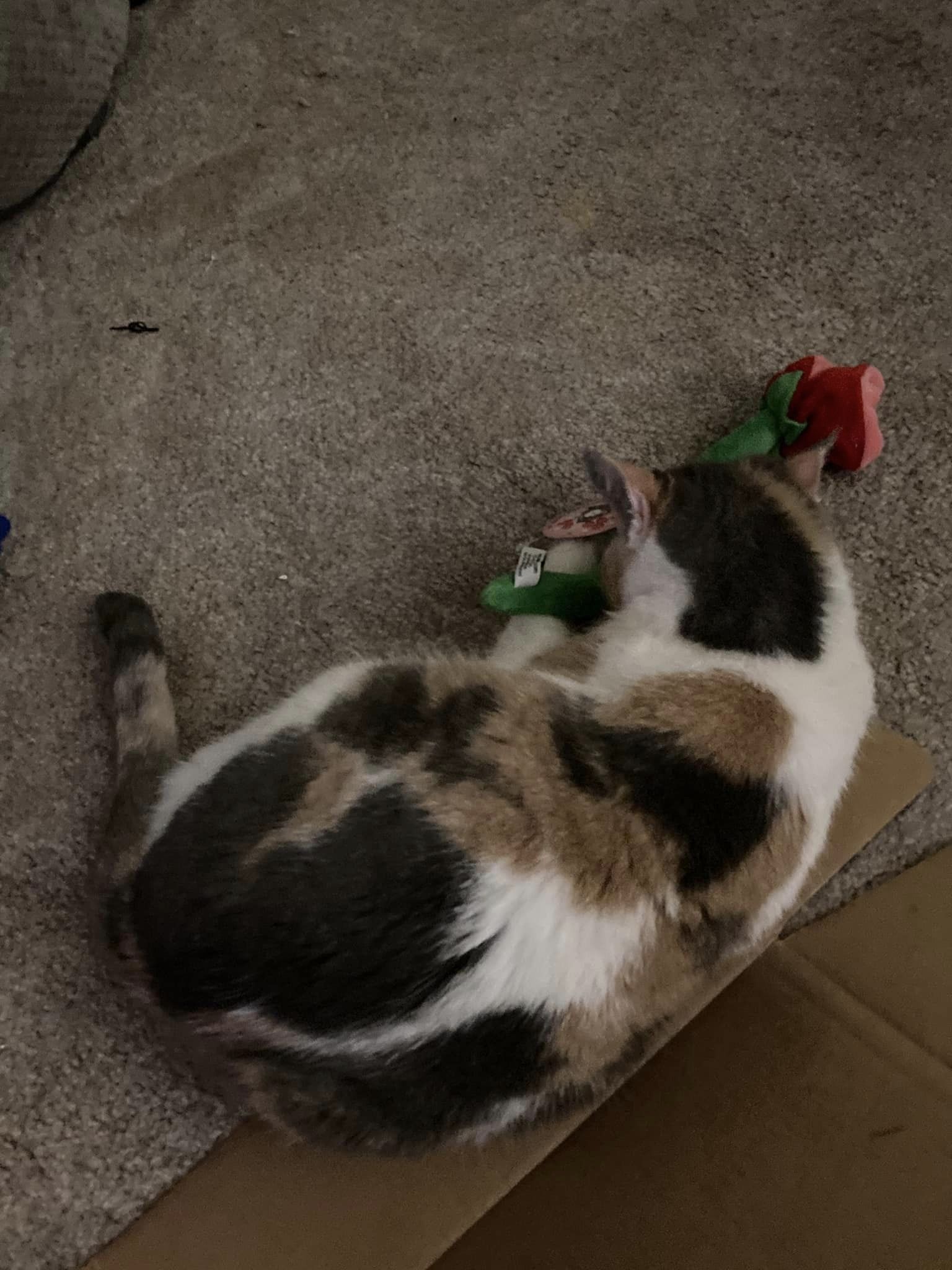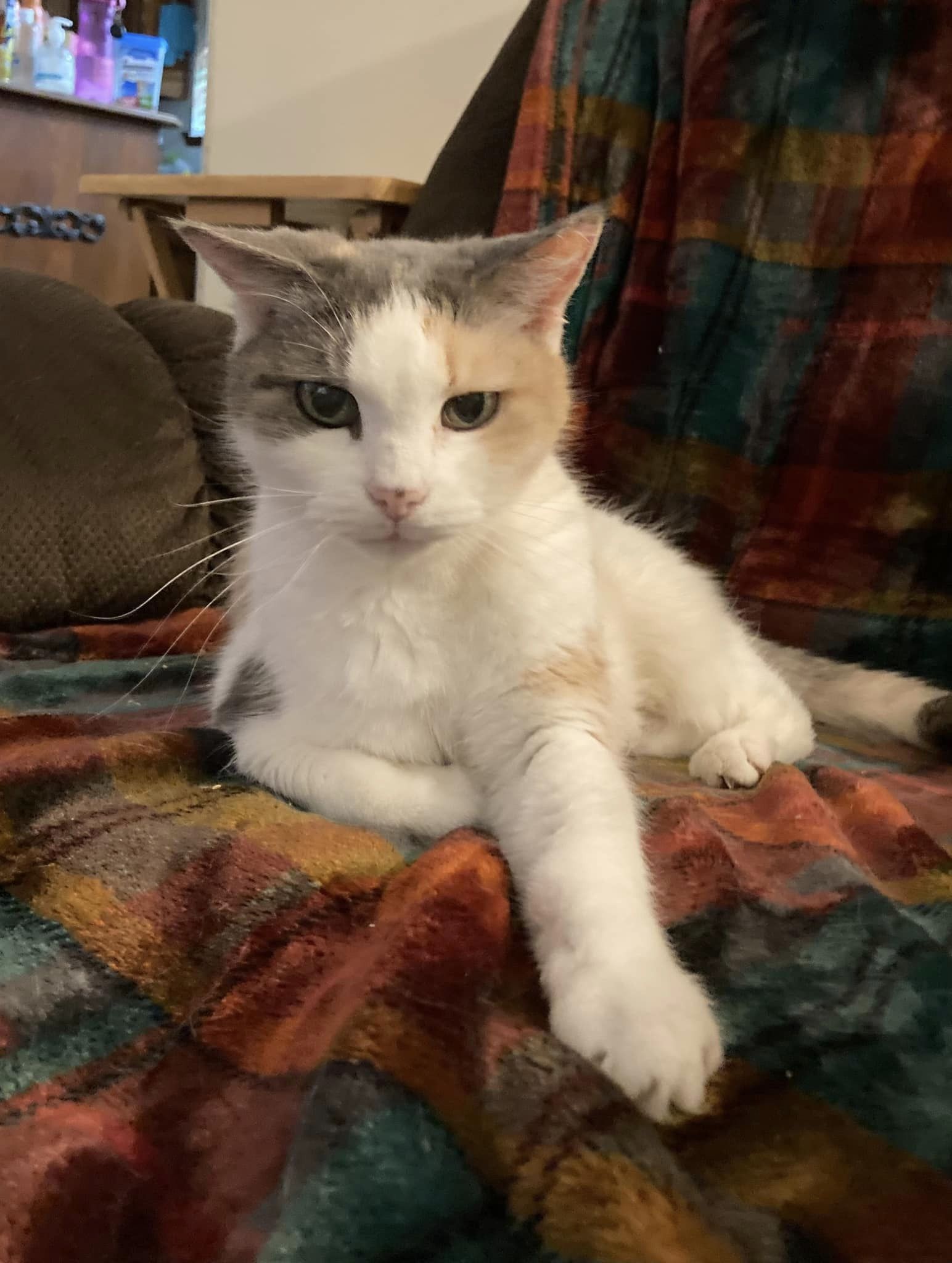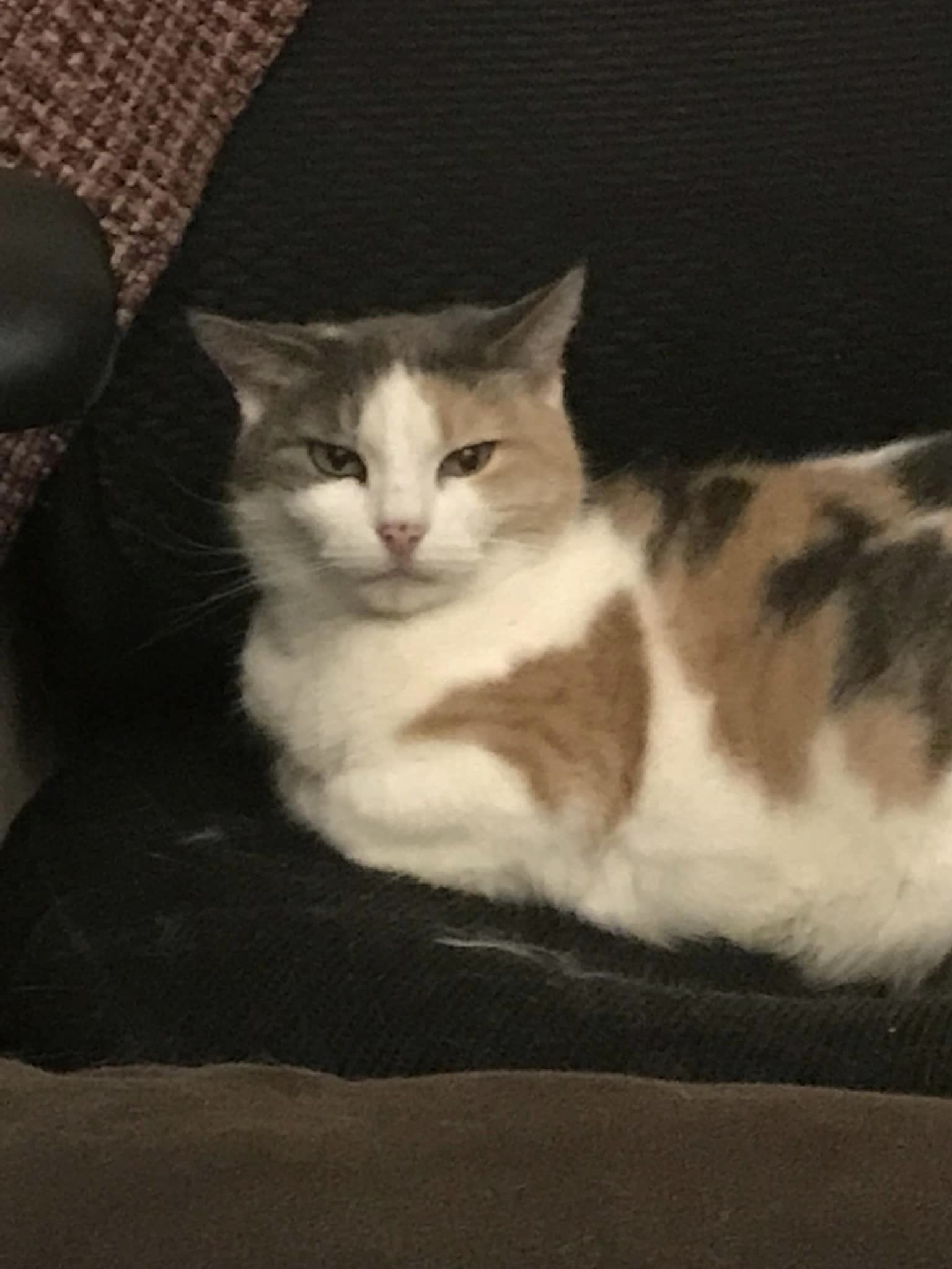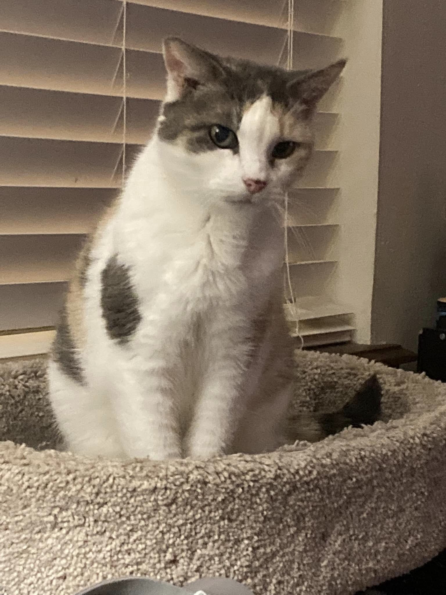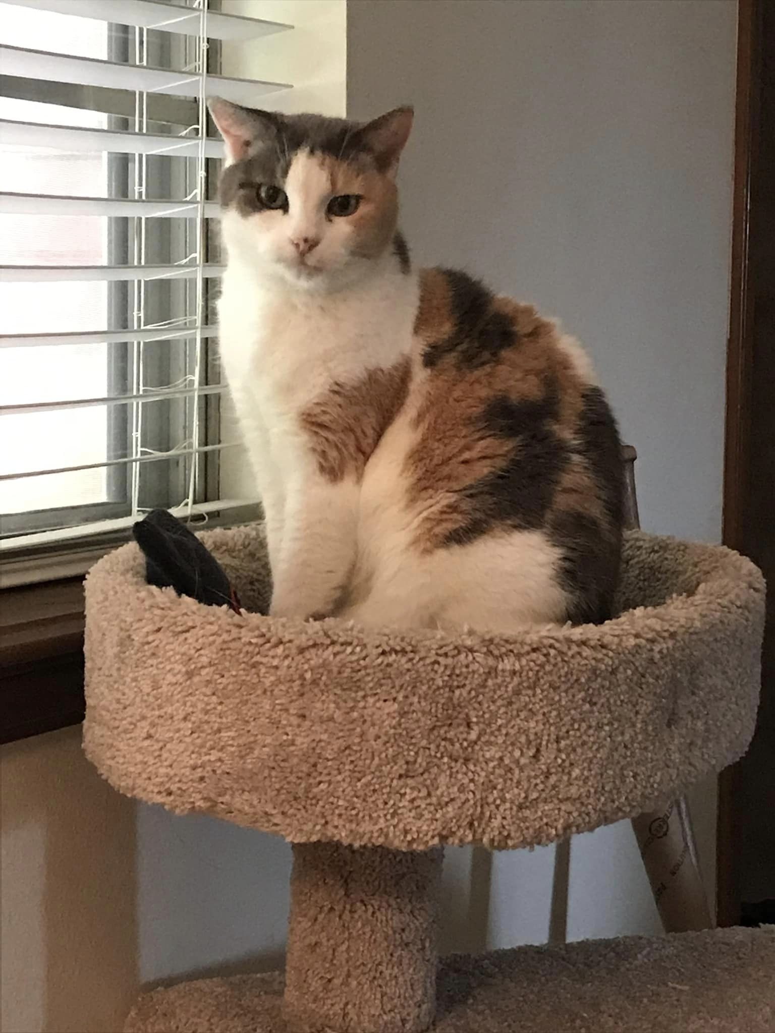 Ms. Katniss graced us with her presence for 20 years. She was a beautiful calico cat with a curiosity that could sometimes get her in trouble. She had a maternal instinct and ability to sense when we needed extra purr time to lift our spirits. She had a magical ability to disappear into any nook or cranny, sometimes for hours at a time- I believe she teleported to other dimensions on multiple occasions! She was a devoted mother to her son, Hugo, often grooming and cuddling him. I do love remembering the chariot races she would have with him when they were both in full zoomies mode. I also remember her being mesmerized by the spin cycle on our top load washing machine (with a clear lid) on more than one occasion She insisted on drinking from red solo cups for the longest timeeventually she got used to a water fountain I will miss her grooming my hand red raw on more than one occasion – im sure she thought I did a terrible job of grooming myself. She was sassy, intelligent and beautiful and we miss her dearly. We were fortunate to have had her with us for as long as we did. Rest In Peace Sweet Pea. We love you always Ms. Katniss.