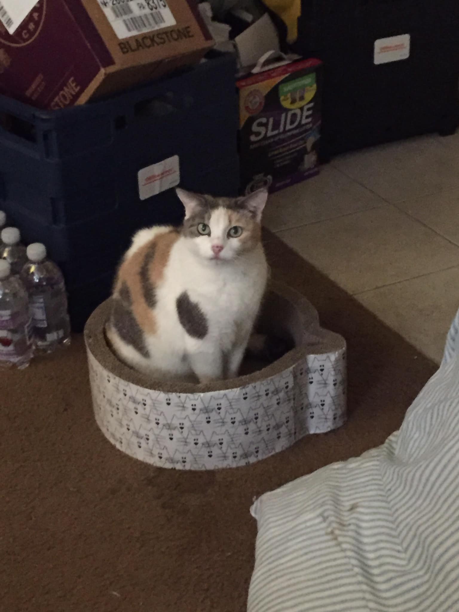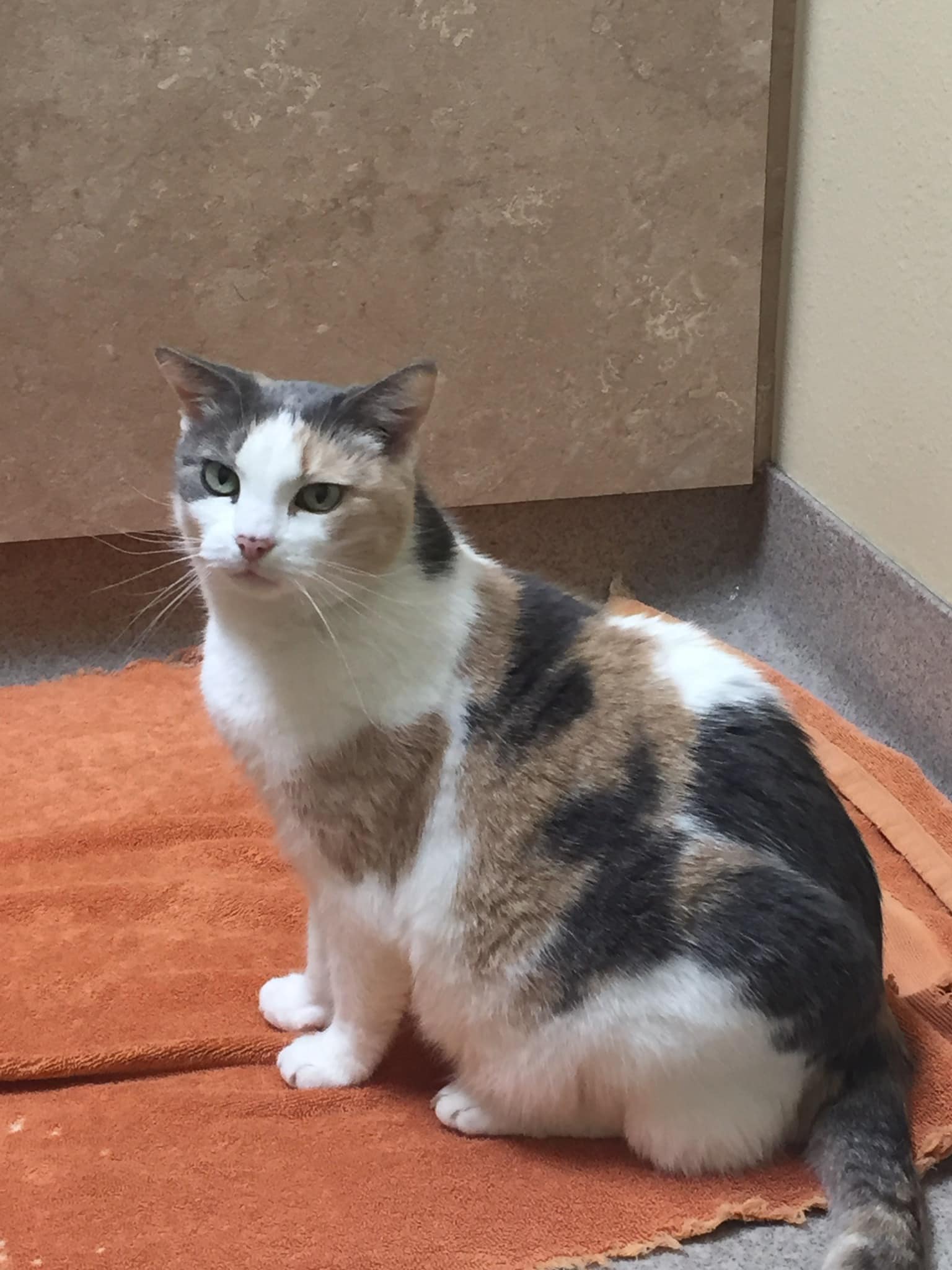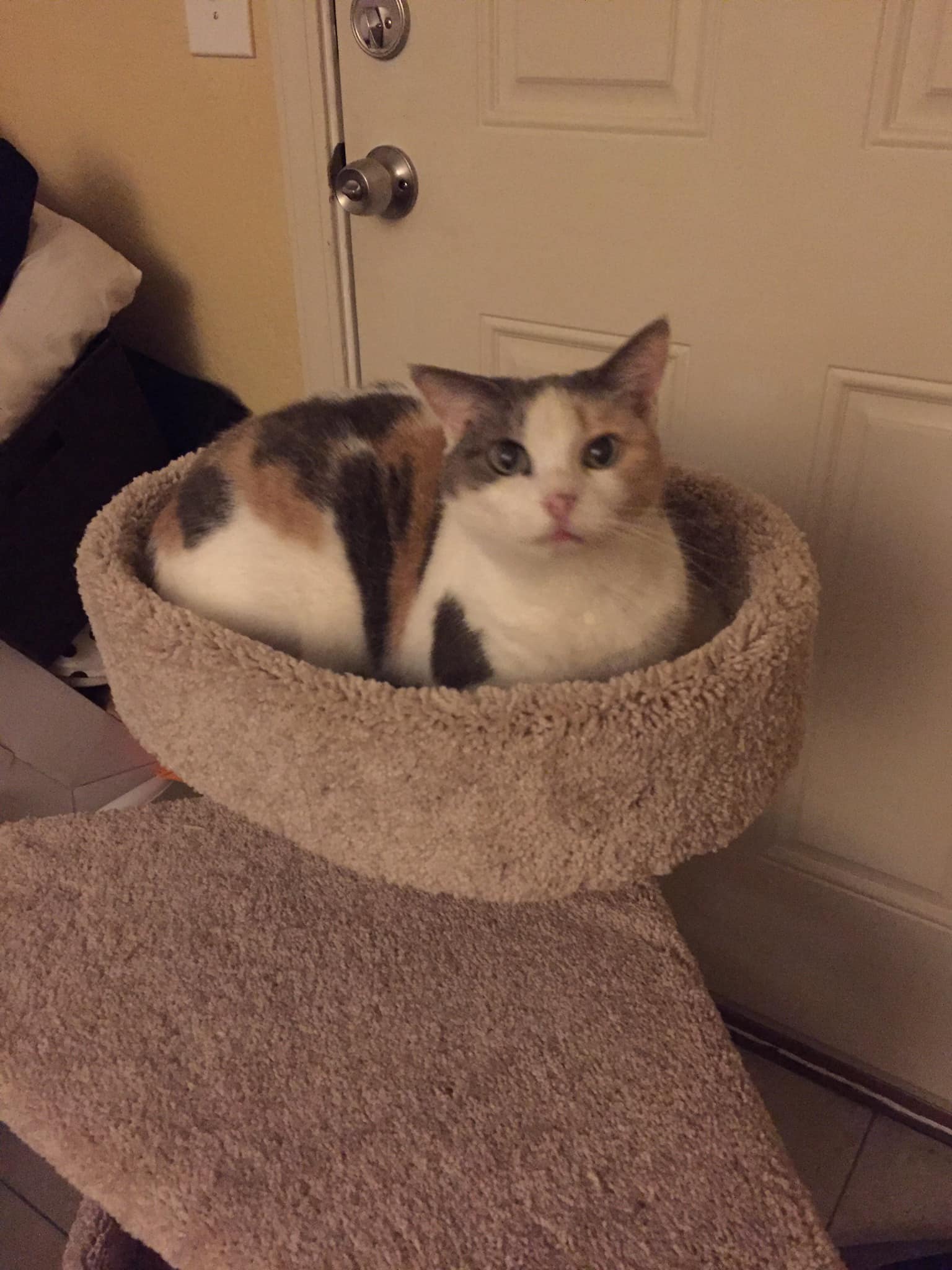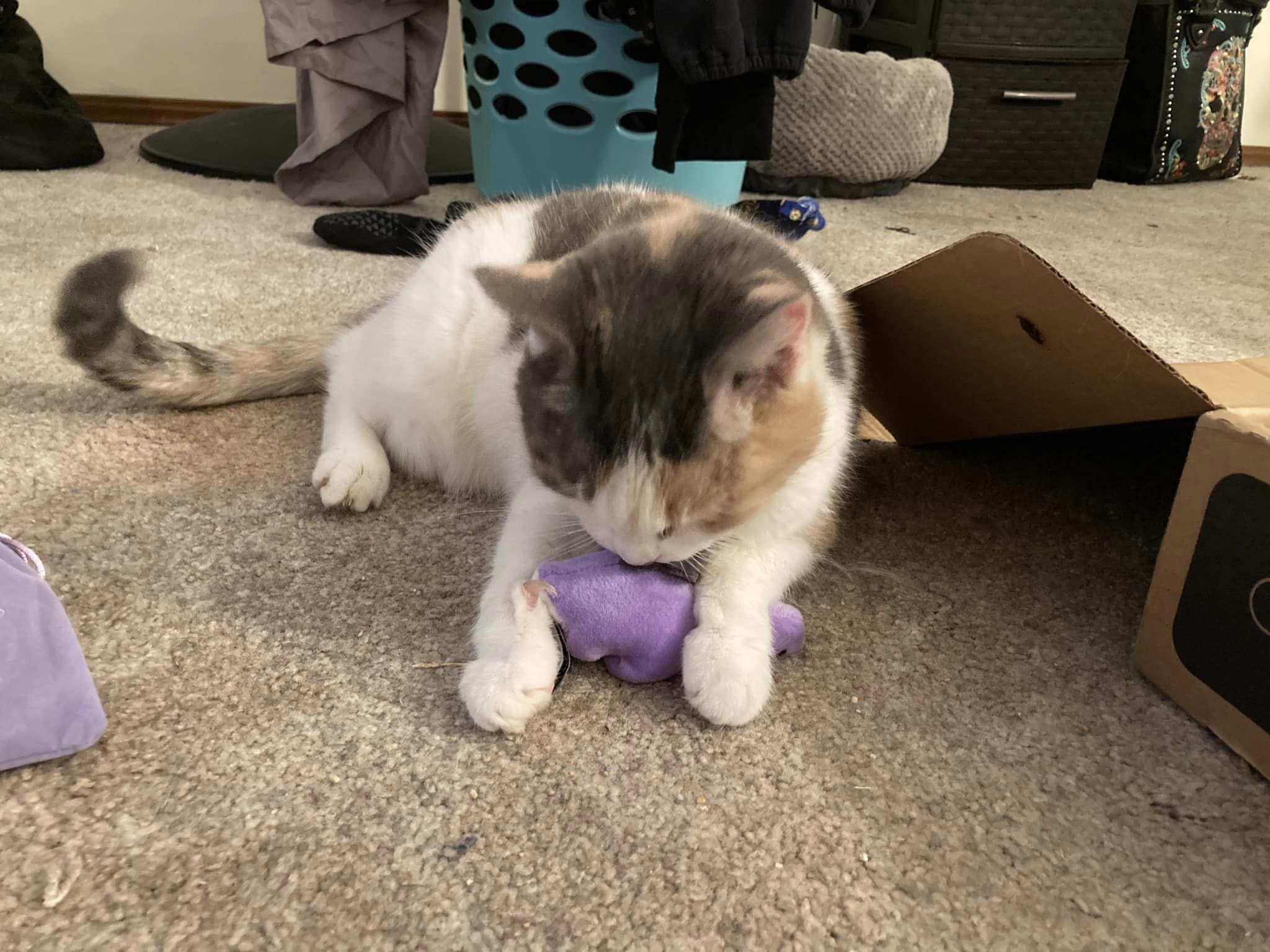 Ms. Katniss graced us with her presence for 20 years. She was a beautiful calico cat with a curiosity that could sometimes get her in trouble. She had a maternal instinct and ability to sense when we needed extra purr time to lift our spirits. She had a magical ability to disappear into any nook or cranny, sometimes for hours at a time- I believe she teleported to other dimensions on multiple occasions! She was a devoted mother to her son, Hugo, often grooming and cuddling him. I do love remembering the chariot races she would have with him when they were both in full zoomies mode. I also remember her being mesmerized by the spin cycle on our top load washing machine (with a clear lid) on more than one occasion She insisted on drinking from red solo cups for the longest timeeventually she got used to a water fountain I will miss her grooming my hand red raw on more than one occasion – im sure she thought I did a terrible job of grooming myself. She was sassy, intelligent and beautiful and we miss her dearly. We were fortunate to have had her with us for as long as we did. Rest In Peace Sweet Pea. We love you always Ms. Katniss.